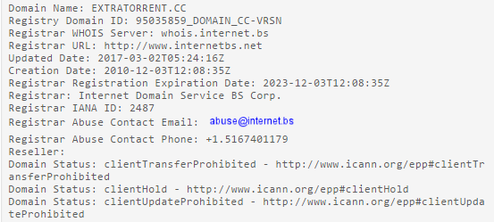 As a result, ExtraTorrent has now lost control over it primary domain ExtraTorrent.cc. Since this morning the site’s domain has become unreachable around the world, and a whois search reveals that this is due to a “clienthold” status.